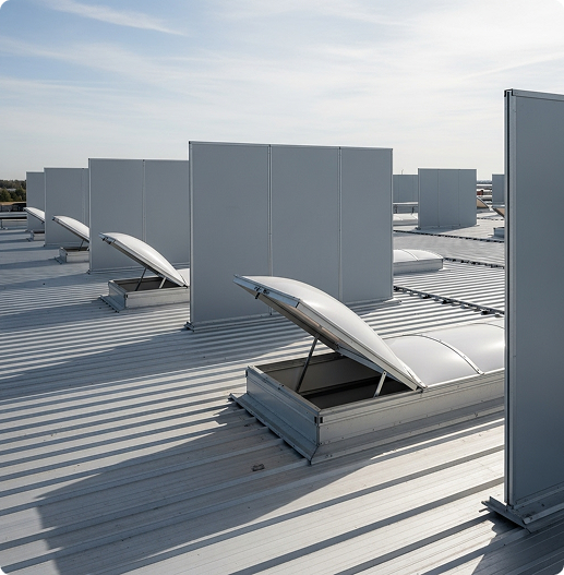 Étude et dimensionnement des exutoires (NSHEV), commandes et ouvrants, installation de lanterneaux/volets et barrières coupe-feu.